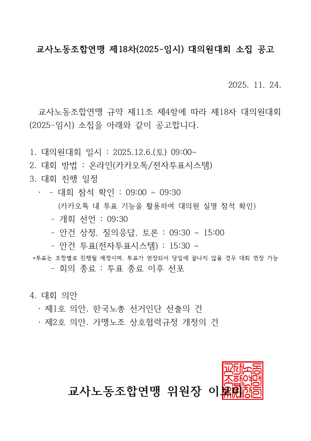 교사노동조합연맹 제18차(2025-임시) 대의원대회 소집 공고 (2025-11-24)