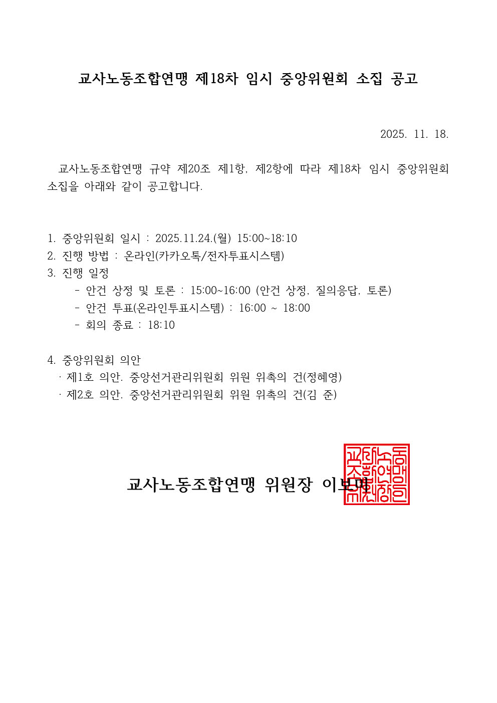 교사노동조합연맹 제18차 임시 중앙위원회 소집 공고 (2025-11-18)
